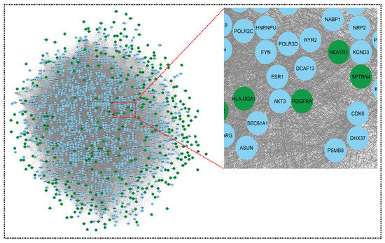 Figure 3. Network representing downregulated genes of sepsis, SLE, and CRS. This downregulated network contains 1351 nodes and 52,455 edges. The CRS GSE series GSE125898 contains 422 downregulated genes and GSE17582 contains 10 downregulated genes. Sepsis and SLE together contribute 13 downregulated genes. Green colors indicate our seed genes and blue are their interacting partner. A zoom view shows clear gene–gene interactions (green colors for seed genes). The nodes are the gene entity, and the edges are the interactions/connections. A gene has multiple connections in the network: gene to gene, gene to itself, and gene to many genes interactions. This complex network is undirected (no direction of edges) and unweighted. To retrieve biological information from the complex network, module analysis methods are used, which reduces complexity.