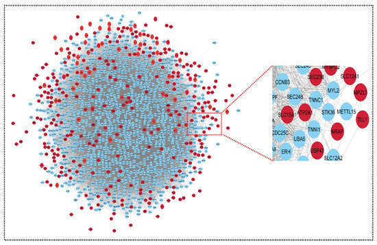 In the merged network, this miRNA–mRNA network merges. Because the merged network already contains many target genes from the miRNA network, it is now known as a shared network. There are now 2091 nodes in the common network, with three miRNAs and 75757 edges (see Figure 7).