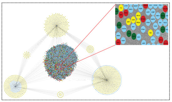 Figure 7. Shared network: this shared network is formed from all the above networks (upregulated network, downregulated network, and miRNA–mRNA network). It contains 2091 nodes and 75,957 edges. The red color indicates upregulated genes, the green color indicates downregulated genes, the yellow color indicates the target genes of miRNAs, and the blue color indicates the interacting genes.