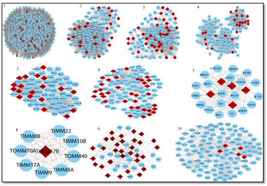 Figure 8. Top ten modules selected from MCODE analysis. Network/modules/sub-modules at different network levels that accommodate leading hubs (red) (fundamental key regulators) and blue nodes indicate interactive partners (other genes).