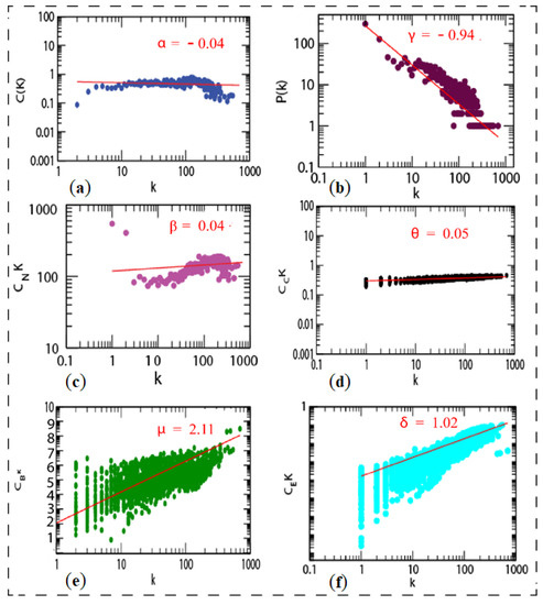 Figure 9. Topological properties of shared network: (a) clustering co-efficient (C(k)), (b) the behaviors of degree distributions (P(k)), (c) neighborhood connectivity (CN(k)), (d) closeness (CC(k)), (e) betweenness (CB(k)), and (f) eigenvector (CE(k)) measurements as a function of degree k for original shared network.