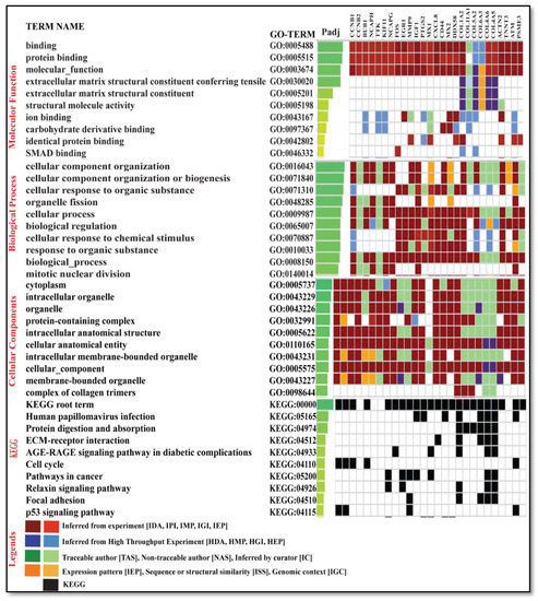 A set of 27 genes were submitted to gProfiler for gene ontology term analysis (molecular function (MF), cellular component (CC), and biological process (BP)) and for pathway analysis using the enrichr database. Forming an idea of the effect of DEGs is only possible when we have some preliminary insight into their individual functions. The gene ontology (GO) term enrichment allows us to obtain information about the genes (see Table S5). The fundamental genes were found to display the differential expression irrespective of the condition, state of disease, and expression pattern (see Figure 10).