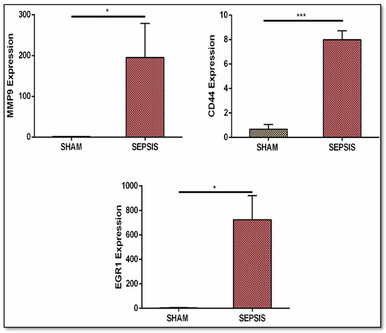 Figure 11. Validation through real-time qRT-PCR analysis of gene expression (MMP9, CD44, and EGR1). Sepsis groups are CLP operated and SHAM groups are control groups. Real-time analysis data showed their upregulated expression. Data are represented as mean ± S.E.M. * p < 0.05 and *** p < 0.001.