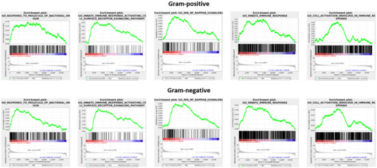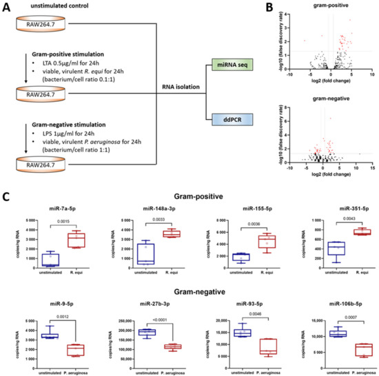 3.1. Gram-Positive Stimulation of Macrophages Induces Upregulation of miR-7a-5p, miR-148a-3p, miR-155-5p, and miR-351-5p, Whereas Gram-Negative Stimulation of Macrophages Induces Downregulation of miR-9-5p, miR-27b-3p, miR-93-5p, and miR-106b-5p