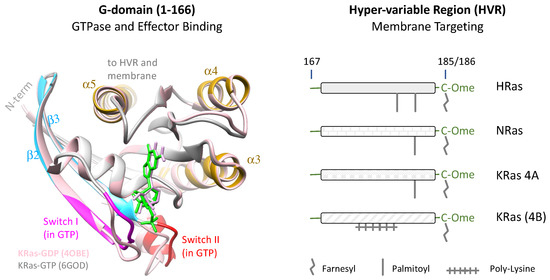 Ras domain structure. Left panel shows a ribbon representation of the heart-shaped Ras G-domain using overlaid KRas-GTP (Protein Data Bank (PDB) 6GOD; GTP shown in green) and KRas-GDP (PDB 4OBE; light pink; GDP in plum) structures as models. Several key elements most relevant to this review, including Switch I (residues 30–40, magenta), Switch II (residues 60–70, red), β-sheets 2 (β2, residues 37–46, sky blue), β3 (residues 49–58, sky blue), and α helices 3 (α3, residues 87–103, bronze), α4 (residues 127–137, bronze), and α5 (residues 152–164, bronze) are highlighted in the KRas-GTP model. Right panel depicts the hypervariable regions (HVRs) of the four major Ras isoforms, namely HRas, NRas, KRas (4A) and KRas (4B) along with the membrane targeting signals (farnesylation, palmitoylation, and the poly-lysine stretch). Figure adapted from ref [32].