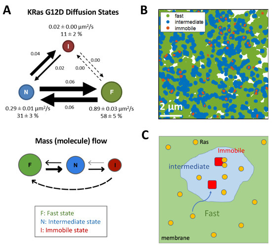 Ras diffusion on the membrane and localization to nanodomains. (A) KRas G12D molecules exhibit three diffusion states on the cell membrane, a fast (F) state, an intermediate (N) state, and an immobile (I) state, with state transitions between the F:N and N:I states but not F:I states. Analysis of this model suggests a net flow of Ras molecules from F to N to I states, and KRas is internalized while in the I state and recycled back to the membrane in regions that support the F state. (B) Mapping the locations of the three diffusion states revealed a nested organization of the membrane domains that confers each state, with each nanodomain that entraps Ras (immobile, red) living inside another, intermediate domain (blue), whereas most the membrane supports fast and free diffusion (green) of Ras. (C) Model depicting how Ras (yellow circles) diffuses on the membrane, frequently encountering the intermediate domains (light blue) and occasionally trapped in structures (red) within the latter, where they presumably form dimers and nanoclusters. (A,B) adapted from [130].