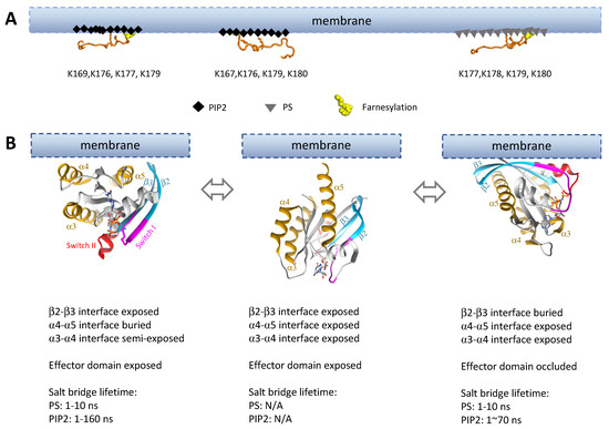 Membrane interactions dictate Ras orientations on the membrane, thus impacting accessibility of the dimer interfaces. (A) Interaction of KRas HVRs with different lipid moieties on the membrane. Two different HVR binding modes to the PIP2-enriched (black diamonds) membrane were observed, while one HVR binding mode was identified for PS-enriched (gray triangles) membrane [146,147]. Lysine residues playing an important role in those interactions are shown with stick representation, and the residue numbers are listed below the HVR structures. (B) Subset of possible conformations sampled by the G-domain on anionic (PIP2 or PS) membranes. All G-domain orientations were rendered to approximation based on literature [144,145,146,148,149,150].