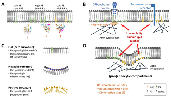 Membrane heterogeneity and topography in Ras dimerization. (A) Heterogeneous distribution of anionic lipids such as PS and PIP2 yields membrane regions with lipid compositions favoring some but not other Ras conformations, which could directly impact Ras dimerization. (B) Example mechanisms that couple actin polymerization with the local enrichment of PS (left) or PIP2 (right), yielding membrane patches of anionic lipids with relatively low mobility, which could entrap membrane proteins such as Ras. (C) Local enrichment of lipids could induce membrane curvature, potentially impacting Ras dimerization. (D) Endocytic and pre-endocytic compartments are examples of enriched anionic lipids coupled with actin polymerization and membrane curvature. There is evidence that Ras immobilization occurs in the same membrane nanodomains that internalize Ras, making some (pre-)endocytic compartments candidate sites for Ras dimerization and clustering. Parts of the figure were based on refs [155,174,175].