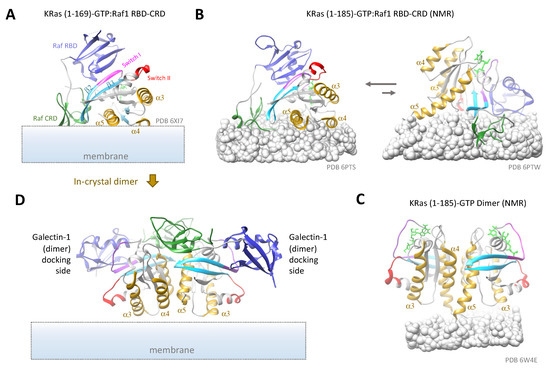 Ras conformations in complexes with binding partners. (A) Crystal structure of GTP-bound KRas G-domain in complex with Raf1 RBD-CRD, showing its orientations in approximation with membrane modeled in, as in ref [197]. (B) NMR structures of full length KRas-GTP in complex with Raf1 RBD-CRD, showing two different conformations of the complex relative to the nanodisc membrane (rendered as gray balls), with the left conformation being dominant at low complex concentrations. (C) NMR structure of full length KRas-GTP dimer on nanodiscs. (D) Potential dimer configuration present in the crystal structure of (A) (PDB 6XI7), as proposed by Cookis et al. [200]. The two Raf1 RBDs (blue) could serve as docking sites for Galectin-1 dimers, leading to formation of Ras nanoclusters [115]. The different proteins domains and motifs are labeled the same way as in (A). The HVRs in (B,C) are either partially buried in or visually blocked by the membrane.