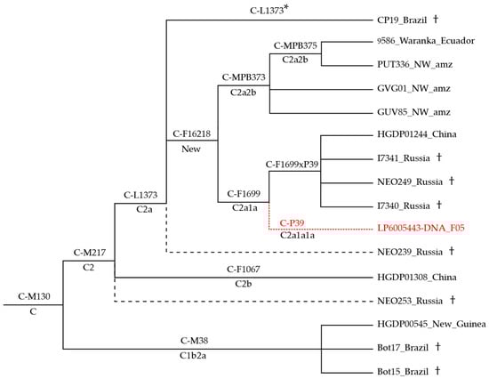 Phylogeny of haplogroup C sub-branches. C-L1373* identifies a Brazilian sample negative for the markers of all other C-L1373 derived branches; dashed black lines indicate less-well-defined samples (missing positions of informative downstream markers); (†) marks ancient samples. ISOGG nomenclature (http://www.isogg.org/tree/, accessed on 19 January 2022) is reported, when available; “New” indicate branches not reported. The placement of the North American C-P39 (in red) is inferred from Pinotti et al. [38].