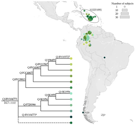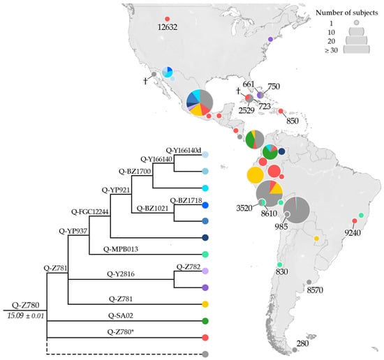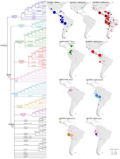 It is of note that the previously reported Q-SA02 [37,78], parallel to Q-Z781, is not represented in our phylogenetic analysis (Figure 3) due to the lack of HC data. Therefore, two Panamanian LC samples (NA5 and NA62), classified as Q-SA02 by [37], are here classified as Q-Z780 (xZ781). This minor lineage appears to be restricted to the Isthmo-Colombian area.