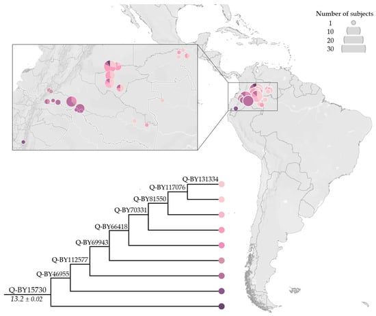 The newly characterised Q-BY15730 (Figure 7) partially overlaps the distribution range of Q-BY104773, and encompasses modern-day individuals from North-West Amazonia, mostly from Tukanoan-speaking groups [36]. Eight sub-lineages were identified, showing a gradient-like distribution from the Ecuadorian Andes to the border between Colombia and Venezuela, with more basal sub-lineages in the West and younger-nested sub-lineages in the East.