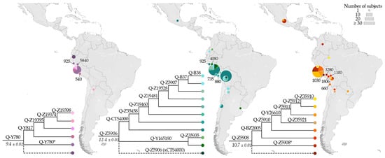 Finally, other smaller and geographically poorly structured clusters were identified downstream of Q-M848, namely: Q-Z19432, Q-Y165186, Q-FT336377, Q-CTS2731, Q-SK1965, Q-BY65986, Q-M19, Q-Z35840, Q-SK1963, Q-Y210513, Q-MPB117, and Q-MPB096 (Figure 3 and Figure S2). Notably, most of these sub-clades, although quite rare, are unevenly scattered throughout South America (Figure S4). This suggests that they represent what is left of unsuccessful lineages that originated before spreading throughout the subcontinent, rather than the legacy of multiple recent locally restricted events. However, the small number of encompassed samples limits the possibility of drawing clear-cut conclusions on their origin and dispersal.