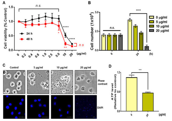 Distinct cell death effect depending on sBV concentration. (A) THP-1 cells treated with various concentrations of sBV for 24 or 48 h. A total of 10 μg/mL of sBV or more shows the growth inhibitory effect. (B) THP-1 cells counted after staining with trypan blue solution. (C) Morphology of cell death detected in a dose-dependent manner. Cell rupture observed in 20 μg/mL concentration. (D) ATP level was measured using a luminometer after 1 h treatment with 20 μg/mL of sBV. Data are presented as mean ± SD. n.s.—no significance, * p < 0.1, ** p < 0.05, *** p < 0.01, **** p < 0.001 (Student’s t-test).