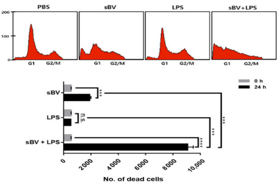 Synergistic cell death effects in combinatory administration with sBV and LPS. FACS analysis performed to examine synergistic effect of sBV and LPS in THP-1 cells. Data are presented as mean ± SD. n.s.—no significance, *** p < 0.01, **** p < 0.001.
