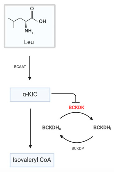 The first step in BCAA catabolism involves the conversion of leucine, isoleucine, and valine into their corresponding branched-chain α ketoacids (BCKAs) by branched-chain aminotransferase (BCAT) located within the mitochondria [3]. The second step consists in the oxidative decarboxylation of BCKAs by the mitochondrial branched-chain α-ketoacid dehydrogenase complex (BCKDC), as demonstrated by Reed and colleagues [4], which represents the thermodynamically irreversible step of BCAA catabolism.