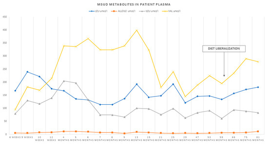 Graphical representation of the trend of BCAAs and alloisoleucine during follow-up and after protein intake liberalization.