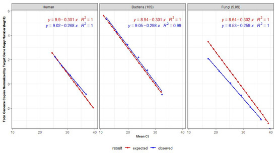 Figure 1. Standard DNA dilution curves for human, bacteria (V1-16S) and fungi (5.8S) qPCR, showing expected (red) and observed (blue) Ct-values considering the genome size and target copy number of the bacteria and fungi present in the mock community. Calculations do not consider the variable ploidy observed in many fungi species. Values used for plotting are shown in Table 1. In the equation, y denotes the genome copy number while x denotes the mean Ct value.