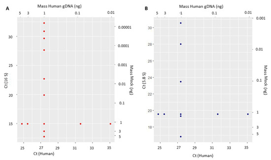 Figure 2. Effects of varying DNA mass over amplification capabilities of bacteria (A) and fungi (B), as compared to human DNA amounts. Horizontal axes indicate the Ct value for human DNA and vertical axes indicate Cts for bacteria (16S) or fungi (5.8S). Each dot represents the mean of a triplicate experiment.