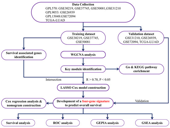 Over the past two decades, the oncogenesis mechanisms of lung cancer have come to be largely understood. It is now widely known that lung cancer is a molecularly heterogeneous disease that features alterations of oncogenes and tumor suppressor genes [4]. A growing number of oncogenic alterations have been identified in non-small cell lung cancer (NSCLC), such as EGFR, ALK, and ROS1. These oncogenic alterations promote the fast development of small molecule-targeting inhibitors for lung cancer therapy [5,6,7]. Moreover, previous studies have revealed that these alterations play essential roles in various pathological processes of LUAD, including tumor progression and metastasis [8,9]. Recently, extensive investigations of the tumor immune microenvironment have facilitated the application of immunotherapy in clinical settings and have dramatically changed the landscape of lung cancer treatment. Programmed death-ligand 1 (PD-1/PD-L1) inhibitors are two main immune checkpoint inhibitors (ICIs) that are applied in the clinic. PD-1 signaling, mainly driven by adaptive PD-L1 expression in tumors, inactivates T cells that identify tumor-specific antigens and promotes tumor progression and metastasis [10,11]. PD-L1 and the tumor mutation burden (TMB) are two independent predictors of responses to immunotherapy [12,13]. Nevertheless, the precise molecular mechanisms of lung cancer are far from being elucidated and more potential prognostic biomarkers are required. In recent years, several studies have identified candidate genes for potential therapeutic targets and diagnostic/prognostic biomarkers of lung cancer through bioinformatics analysis. For example, it was reported that seven genes were analyzed as potential diagnostic biomarkers for NSCLC based on the Gene Expression Omnibus (GEO) and The Cancer Genome Atlas (TCGA) databases [14]. Moreover, the dysregulation of non-coding RNAs, including long non-coding RNAs (lncRNAs) and miRNAs identified by bioinformatics analysis, was found to be associated with carcinogenesis [15]. Though much progress has been made in the treatment of LUAD, it is still necessary to identify putative biomarkers for the precise diagnosis and prognosis valuation of LUAD patients.