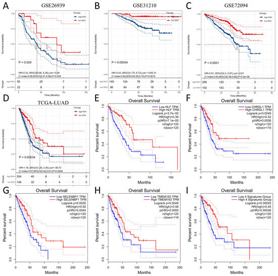 Prognostic value of the four-gene signature. (A) Univariate survival analysis of the high RSO group and low RSO group in GSE26939 (RSO = −0.39); (B) Univariate survival analysis of the high RSO group and low RSO group in GSE31210 (RSO = −1045.31); (C) Univariate survival analysis of the high RSO group and low RSO group in GSE72094 (RSO = −2.61); (D) Univariate survival analysis of the high RSO group and low RSO group in TCGA-LUAD (RSO = −36.73); (E) K-M survival curves of the low and high HLF groups in the GEPIA database; (F) K-M survival curves of low and high CHRDL1 groups in the GEPIA database; (G) K-M survival curves of the low and high SELENBP1 groups in the GEPIA database; (H) K-M survival curves of the low and high TEEM163 groups in the GEPIA database; (I) K-M survival curves of the low and high four-gene signature groups in the GEPIA database.