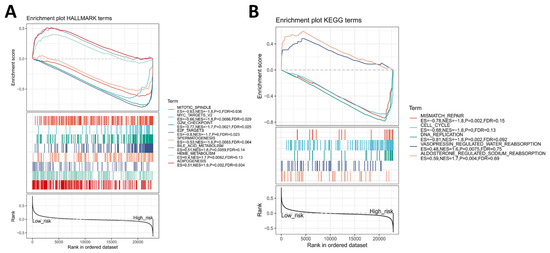 The four-gene signature-associated hallmark and KEGG pathway. (A) Enrichment hallmarks in the low- and high-risk groups. (B) Enrichment KEGG pathways in the low- and high-risk groups.
