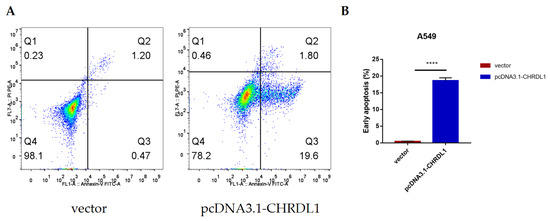 To ascertain whether CHRDL1 was a tumor suppressor gene in lung cancer, we performed an apoptosis analysis (Figure 8). A549 cells were treated with CHRDL1 overexpression plasmids for 24 h and then examined using flow cytometry. As shown in Figure 8A, it was clear that CHRDL1 overexpression could induce the early apoptosis of A549 cells. Additionally, a significant change between the vector group and the pcDNA3.1-CHRDL1 group (p < 0.0001; Figure 8B) was found.