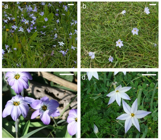 Plate depicting morphological variation of cultivated (a,c) and natural (b,d) materials. (a) Ipheion uniflorum Raf. at BGBM (Berlin). (b) Population of I. uniflorum from the Central region (Azul, Buenos Aires). (c) I. uniflorum ‘Rolf Fiedler’ from Ezeiza Botanical Garden (Argentina). (d) Plants of I. uniflorum from the Central region (Mar del Plata, Buenos Aires). Photo credits: L.M. Giussani and A.B. Sassone. The bar represents 2 cm (a,b) and 1 cm (c,d).