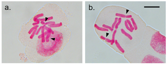 Mitotic metaphase cells of wild (a) and cultivated (b) I. uniflorum plants. (a) Sample AS98; (b) Sample AS247. Arrowheads identify centromeres of submetacentric chromosomes. The bar represents 10 μm.