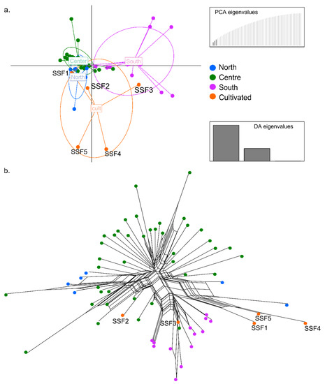 This agrees with the DAPC and neighbor-net analyses that place three of the cultivated genotypes in-between individuals from the different regions by holding variable levels of admixture and segregates the other two (Figure 3a,b). For these two cultivated individuals (SSF4 and SSF5), the DAPC analysis identifies a new genomic composition of sequences that differs from the explored wild populations (Figure 3a,b). This indicates substantial genetic differences between these two cultivated genotypes and the natural genotypes studied in this paper. Whether SSF4 and SSF5 are derived from an otherwise extinct population/genotype no longer found today remains an open question.