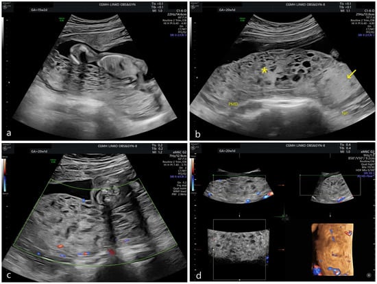 Here, we present a 35-year-old female, who was pregnant at 15 weeks of gestation when she first visited our clinic. This is her second pregnancy, and her previous pregnancy ended with spontaneous abortion at early gestation. She was pregnant after using clomiphene. At 15 weeks of gestation, ultrasonography showed multicystic changes in the placenta with a viable, normally structured fetus (Figure 1a). The placental cysts ranged in size from 0.5–1.0 cm. Adequate fetal growth and normal amniotic fluid amount were seen. Biochemistry study from maternal serum revealed β-hCG as 58,247 mIU/mL and an elevated α-fetoprotein of 149.3 ng/mL (which was 3.73 multiple of median (MoM)) [4]. Based on ultrasound findings and an elevated maternal serum α-fetoprotein, PMD was suspected, and detailed prenatal genetic testing was suggested. Amniocentesis was performed at 17 weeks, which revealed the karyotype as 46, X, isochromosome Xq10. Array CGH confirmed the copy number variation as Xp deletion and Xq duplication. Level 2 ultrasound showed normal fetal structure and an enlarged placenta containing two parts: dysplastic and non-dysplastic parts (Figure 1b). Low vascularity was detected in the dysplastic placenta via Doppler scan and 3D reconstruction (Figure 1c,d). Genetic counseling was given, and the mother decided to terminate the pregnancy due to an isochromosome of the long arm of chromosome X, a Turner syndrome variant. An abortus with its dysmorphic placenta was delivered smoothly. The fetus’s general appearance was normal without omphalocele, macroglossia or appearing macrosomic.