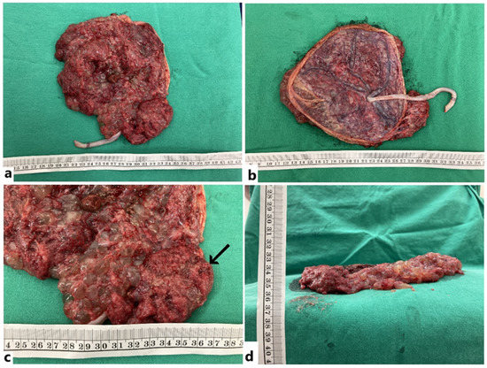 Gross appearance of the placenta and the fetus. (a) Maternal side; (b) Fetal side with centrally inserted umbilical cord; (c) Small portion of non-dysplastic placenta (arrow); (d) Lateral view of placenta.