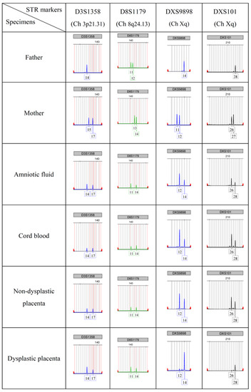 Short tandem repeat (STR) of blood of father, blood of mother, amniotic fluid, cord blood, non-dysplastic placenta and dysplastic placenta. All products of conception shared the same allelic signal.