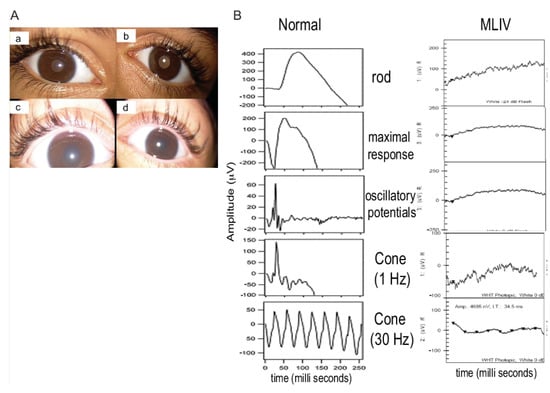 - Reis, S.; Sheffer, R.N.; Merin, S.; Luder, A.S.; Bach, G. Mucolipidosis type IV: A mild form with late onset. Am. J. Med. Genet. 1993, 47, 392–394. [Google Scholar] [CrossRef] [PubMed]