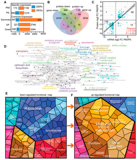 Proteogenomics integrating analysis of neonatal and adult heart: (A) The differentially expressed genes (DEGs) and differentially expressed proteins (DEPs) identified in neonatal and adult heart in different comparison. (B) Venn diagram shows the common expressed mRNAs/proteins in the neonatal and adult heart. (C) Pearson analysis demonstrates that the common mRNA/protein was well relative. (D) Cyto-scape plugin CytoGO shows the complex network of common changed mRNA/protein for the neonatal and adult heart. (E,F) The Proteomap shows the proportion change in down-regulated (E) and up-regulated (F) functional models.