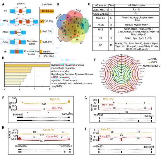 Alternative RNA processing changes occur during heart maturation: (A) Alternative splicing (AS) events categorized by different patterns and the proportion of total AS events in neonatal and adult heart. SE: skipped exon, MXE: mutually exclusive exon, A3SS: alternative 3′ splice acceptor site, A5SS: alternative 5′ splice acceptor site, IR: intron retained. (B,C) Forty AS genes overlapped with differentiated expressed mRNAs/proteins and Venn analysis demonstrates the AS events distribution (B) and the detailed information are listed (C). (D) Functional analysis of these 40 AS genes by Metascape. (E) AS gene expression change at transcript and protein levels. (F,H), RNA sequencing read of Myh7 undergoes A5SS (F), Mpc1 (G), Coq8a (H), and Sorbs (I) undergoes SE in the P0 and P60 hearts.
