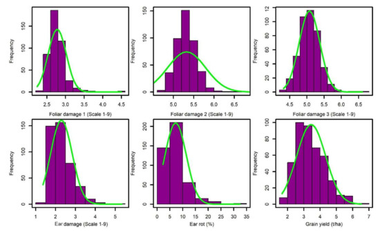 Frequency distribution of means for foliar damage scores 7, 14, and 21 days after artificial infestation (foliar damage score 1, 2, and 3), ear damage, ear rot (%), and grain yield (t/ha).