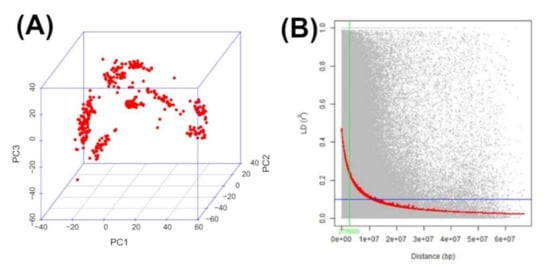 GWAS statistical power and resolution is reduced if the phenotypes of interest are significantly correlated with relatedness or population structure [57]. PCA based on the observed genotype data showed no clear pattern of population stratification (Figure 3A). The proportion of total variability explained by the first, second, and third principal components (PC1–3) was 9%, 6%, and 5%, respectively. Figure 3A shows a three-dimensional scatter plot of the first three principal components which together contributed about 20% of the total variation in the data.