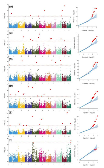 - Wang, S.-B.; Feng, J.-Y.; Ren, W.-L.; Huang, B.; Zhou, L.; Wen, Y.-J.; Zhang, J.; Dunwell, J.M.; Xu, S.; Zhang, Y.-M. Improving Power and Accuracy of Genome-Wide Association Studies via a Multi-Locus Mixed Linear Model Methodology. Sci. Rep. 2016, 6, 1–10. [Google Scholar] [CrossRef] [Green Version]