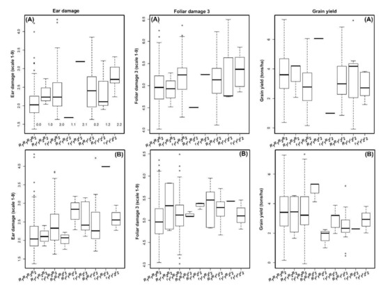Larger peaks on the Manhattan plots were suggestive of a strong association between the surrounding genomic region and the corresponding phenotypic trait and warrants further validation. Grain yield under artificial FAW infestation, for instance, exhibited peaks of association signals on chromosomes 4 and 10 which could be due to strong selection pressure during the breeding and domestication process [75]. While biological functions of uncharacterized candidate genes could not be inferred, SNP (DT8_165429441), strongly associated (p = 10−5) with leaf damage scores 14 days after infestation, was found within a genomic region containing the GRMZM2G016802 gene that participates in the defense response by restricting injury occurrence and enhancing recovery after injury [23]. The allelic effect of some of the selected markers (two SNPs in boxplots A with DT1_34838367 and DT2_192225273 and boxplots B with DT5_86480332 and DT6_108383751) clearly support the effective role in improving the level of FAW resistance (Figure 5). These consistent regions or SNPs could potentially help the breeders to design an effective strategy to introgress these QTNs in relevant breeding materials through marker-assisted breeding.