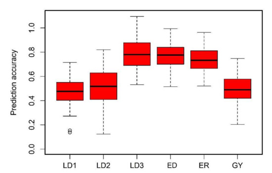 Box plots showing genomic prediction accuracy for six traits evaluated under artificial FAW infestations. LD1, LD2, LD3: foliar damage rating at 7, 14, and 21 days after artificial FAW infestation, respectively; ED—ear damage, ER—ear rot, GY—grain yield.