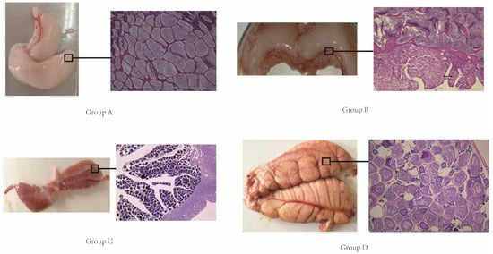 A picture of different sex phases and slices. Group (A): male gonads. Group (B): male-dominated hermaphroditic gonads. Group (C): female-dominated hermaphroditic gonads. Group (D): female gonads.