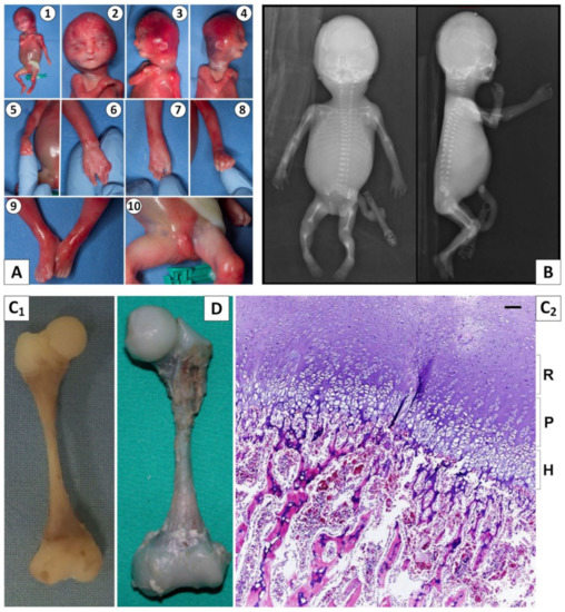 Clinical case #1. (A1–4) Frontal bossing, bitemporal narrowing with supra-auricular bulging and parietal bossing, short palpebral fissures, hypertelorism, narrow mouth, low-set ears. (A5–8) Camptodactyly of proximal interphalangeal joints of the 2nd–5th fingers. (A9) Bilateral short hallux. (A10) Micropenis. (B) Babygram X-rays: underossification of the skull, 11 pairs of thin ribs, mild platyspondyly, mild irregular cervical vertebrae, thin long bones with increased density, metaphyseal flaring and with obliteration of the medullary cavity. (C,D) Pathological examination of femur: (C1) macroscopically, the femur had a thin diaphysis with splayed metaphyses, and appeared similar to the picture (D) originally presented by Unger et al. [7]. (C2) Histological examination: architecture of the growth plate of the proximal femur showing a normal resting cartilage (R), a rarefied proliferating zone (P) and narrow cartilage lacunae in the hypertrophic zone (H). Scale bar = 25 μm.