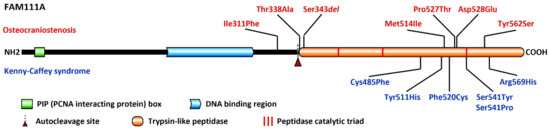 Through homology comparison and functional studies, the protein encoded by FAM111A is emerging as a serine protease putatively involved in DNA replication and response to replication stress [34,35,36,37,38]. FAM111A colocalizes with the replication fork, possibly interacting with single-strand DNA through its central region, while its C-terminal portion features a conserved Ser/His/Asp catalytic triad and acts as a chymotrypsin-like peptidase (Figure 3). Although its exact biological targets are still being investigated, auto-cleavage activity has been documented, both in cis and in trans, suggesting that multiple copies of FAM111A might interact with other factors to form active complexes [36,37,38]. Interestingly, the SWISS–MODEL server reports a high homology with serine protease HtrA2, which is known to function as a trimer [39].