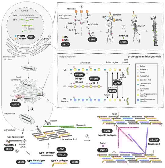 The pleiotropic and multisystemic nature of EDS is caused by alterations in the physical properties of the ECM in many tissues and organs, which, in turn, is the result of a compromised biosynthesis, fibrillogenesis and/or supramolecular organization of collagen fibrils due to pathogenic variants in different genes (Figure 2).
