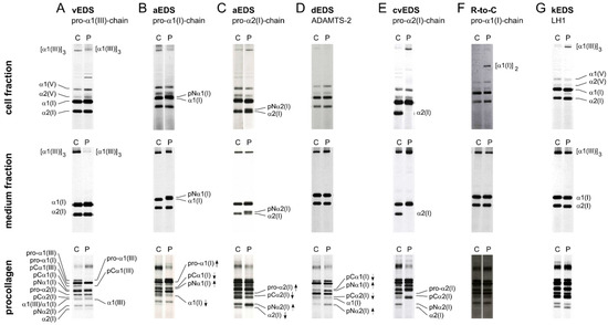 Decreased N-propeptide cleavage of the type I procollagen N-propeptide can also be caused by defects in the type I procollagen N-proteinase, ADAMTS2, due to biallelic loss-of-function variants in the ADAMTS2 gene, which gives rise to the dermatosparaxis EDS type (dEDS). In contrast to aEDS, where either the pro-α1(I)-or the pro-α2(I)chain is affected, cleavage of both pro-α(I)-chains is compromised in dEDS. ADAMTS2 is also known to possess N-proteinase activity for types II, III and V pro-collagens and enzymatic activity for some other molecules [44,45], which likely contributes to the phenotypic differences between aEDS and dEDS.