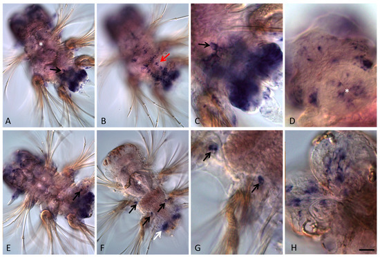 The whole-mount in situ hybridization (WMISH) experiments were performed as described previously [33]. Objects were rehydrated from MetOH then rinsed in PTW, treated with proteinase K (100 µg/mL) for 0.5–2.5 min at +22 °C, twice rinsed in glycine (2 mg/mL), postfixed with 4% PFA on PTW for 20 min. The samples were washed in PTW before the pre-hybridization step. After incubation with the DIG-probe, subsequent washes, overnight incubation with anti-digoxigenin AP antibodies (dilution 1:2500), and washing, the objects were stained with NBT/BCIP, followed by washing in PTW and mounting in 90% glycerol. In situ hybridization with the sense, DIG-labeled riboprobe was used as a negative control (Supplementary Materials Figure S1).