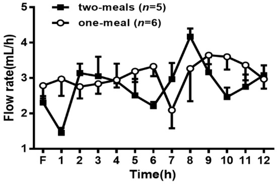 Comparison of the lymph flows rate between the two-meal and one-meal groups. Mesenteric lymph flow was measured at hourly intervals before and immediately after lipid infusion for 12 h. Values are expressed as means ± standard error of mean (SEM).