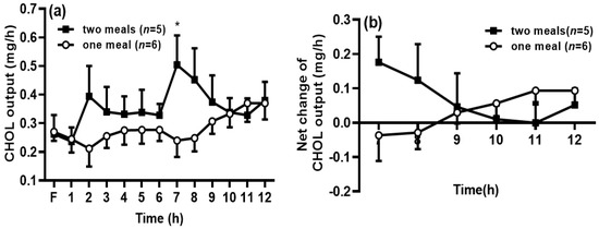 A similar trend was found in the CHOL output in the lymph. After the rats in the two-meal group received the first dose of intralipid, the CHOL output was increased, but the difference was not significant between the two-meal and the one-meal groups. It is interesting to find that the CHOL output significantly increased after the second meal at 7 h compared with that in the one-meal group (p < 0.05) (Figure 3a). However, the net CHOL output was comparable between the two groups (Figure 3b).