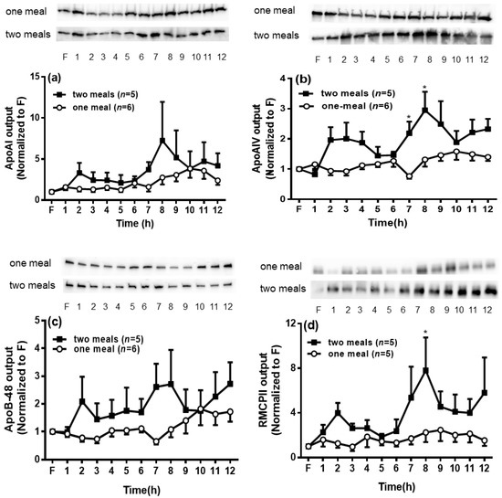 We next examined the secretion of apolipoproteins (apo), including apoA-I, apoA-IV, apoB-48, and RMCPII in the lymph of the two groups of rats. As shown in Figure 6a,c, the hourly lymphatic outputs of apoB-48 and apoA-I were comparable between these two groups of rats. Interestingly, the second lipid meal significantly increased the apoA-IV levels in the lymph at 7 h and 8 h, and the RMCPII levels at 8 h (p < 0.05) (Figure 6b,d).